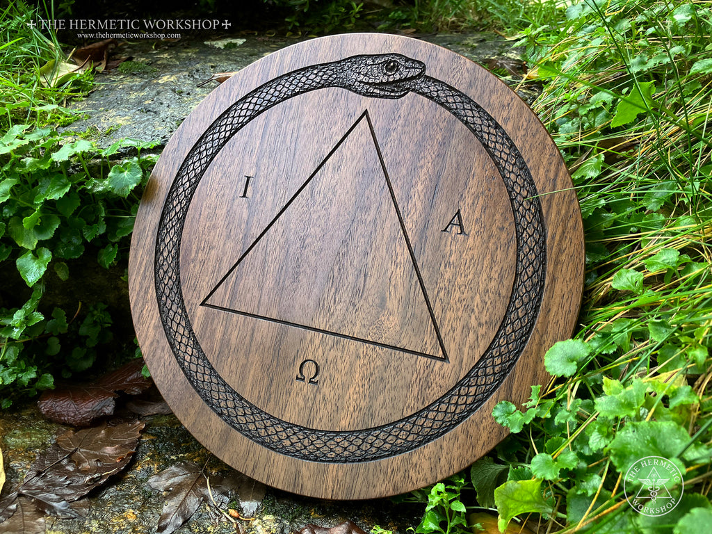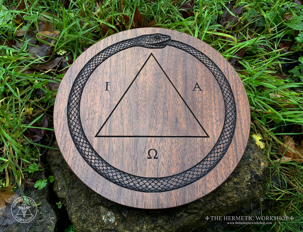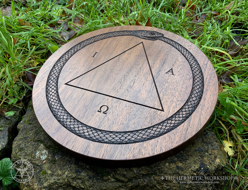 So, why do I call it the "The Magician's Master Table"? Is it the most powerful table of practice ever? Haha, no. I called it this as it's a personal and practical synthesis of a design I've developed through my own experience. It's designed as a focal piece for a working altar. IAO is carved around the central triangle as an expression of the divine principle bringing the focus of the work into manifestation (the triangle) -- a focal point of the work, if you will. The Ouroboros is carved around the edge, enclosing the work like a magic circle whilst representing unity and cosmic cycles. It's ideal for PGM and Hermetic magic, HGA work and sorcery in general.