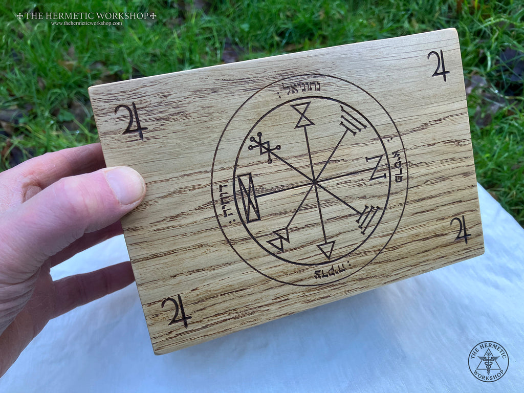 The two sides are carved with the sigils of both the Intelligence of Jupiter (Yophiel) and the Spirit of Jupiter (Hismael) as detailed by Agrippa. The Seal of Jupiter is carved upon the front panel. Upon the lid, the 1st Pentacle of Jupiter from the Key Of Solomon is carved, surrounded by the Astrological sign of Jupiter in each corner. To seal the box the Kamea of Jupiter is carved on the underside of the lid.