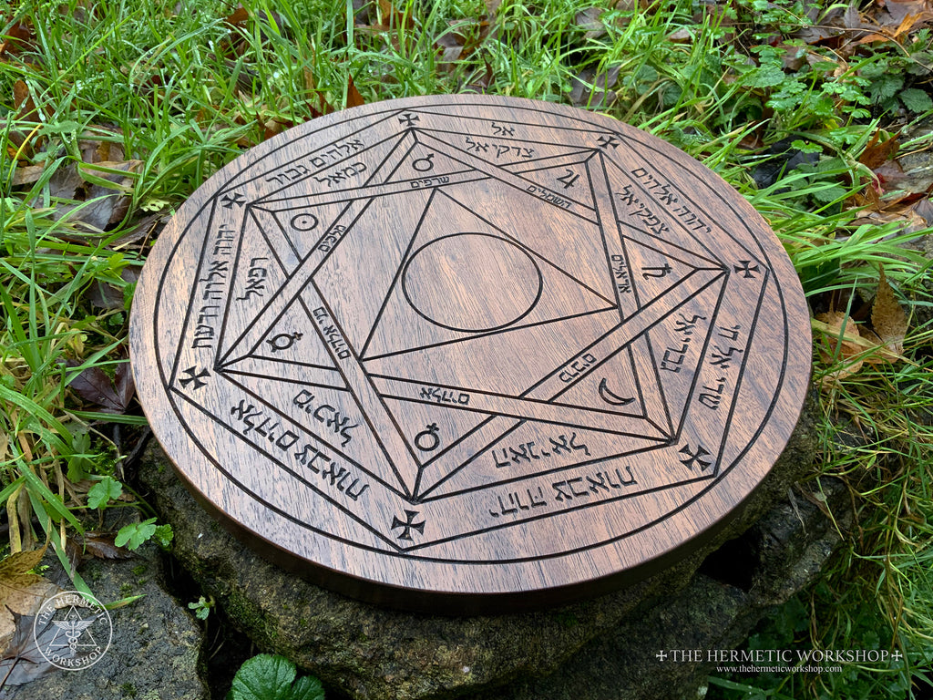 Planetary Magic Table of Practice with Sacred Geometry, Holy Names and Archangels in Hebrew. Carved in solid walnut. Evocation. Kabbalistic Angel Magic. Planetary Angels.  Hermetic Ceremonial Magic Altar Board. Occult Altar Tools.